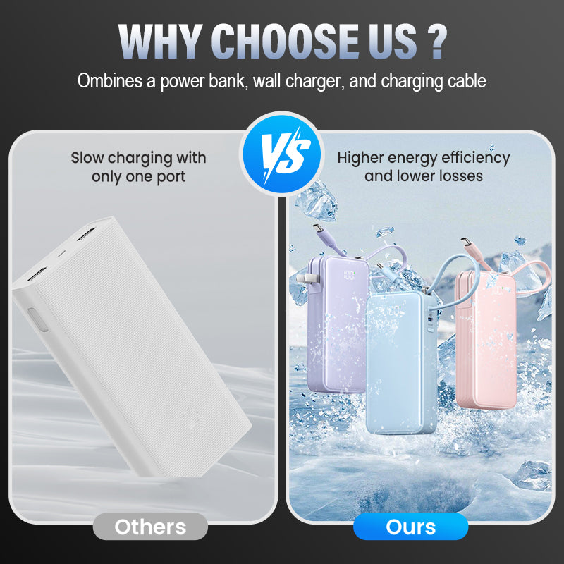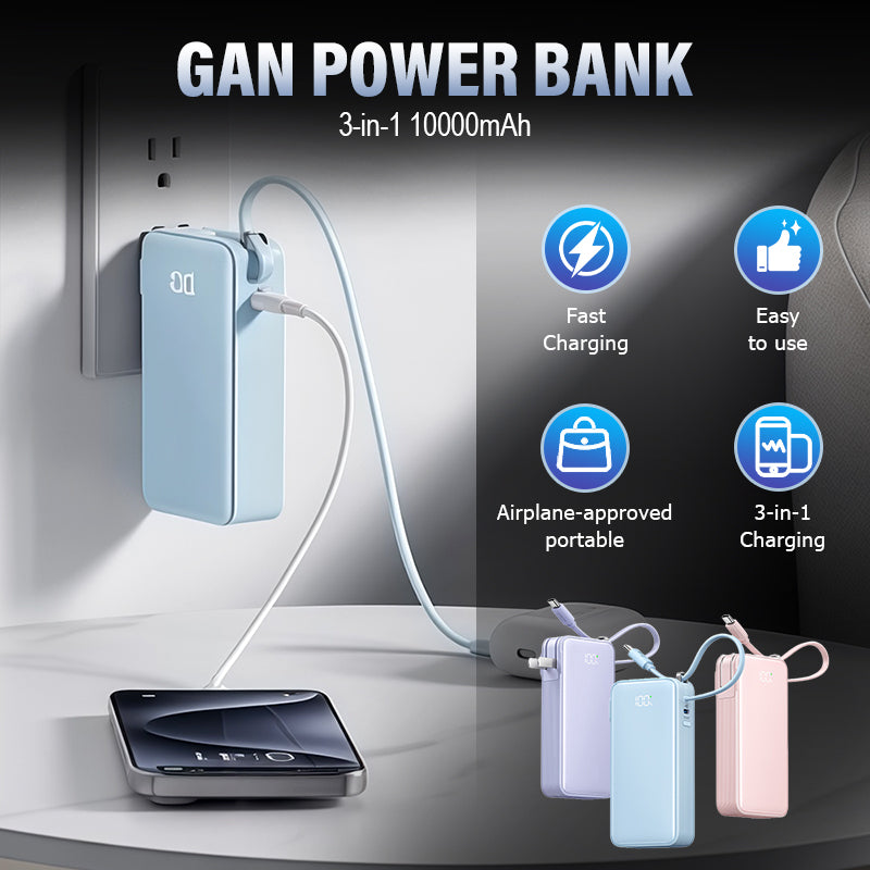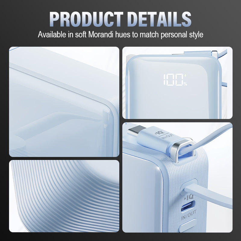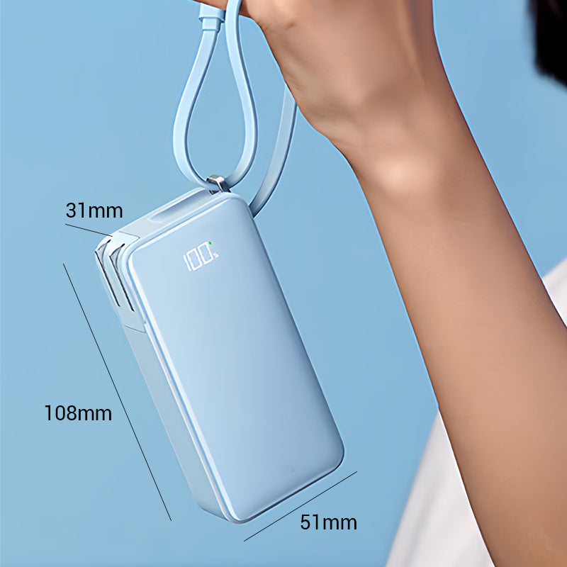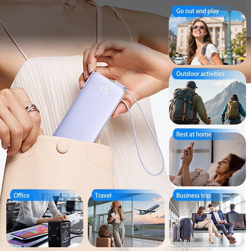 3-IN-1 DESIGN FOR TOTAL CHARGING FREEDOM: Combines a power bank, wall charger, and charging cable into one seamless device. No need to carry multiple accessories—simply plug directly into any outlet. The built-in flip prongs use diamond-coated plating for safe, spark-free insertion.