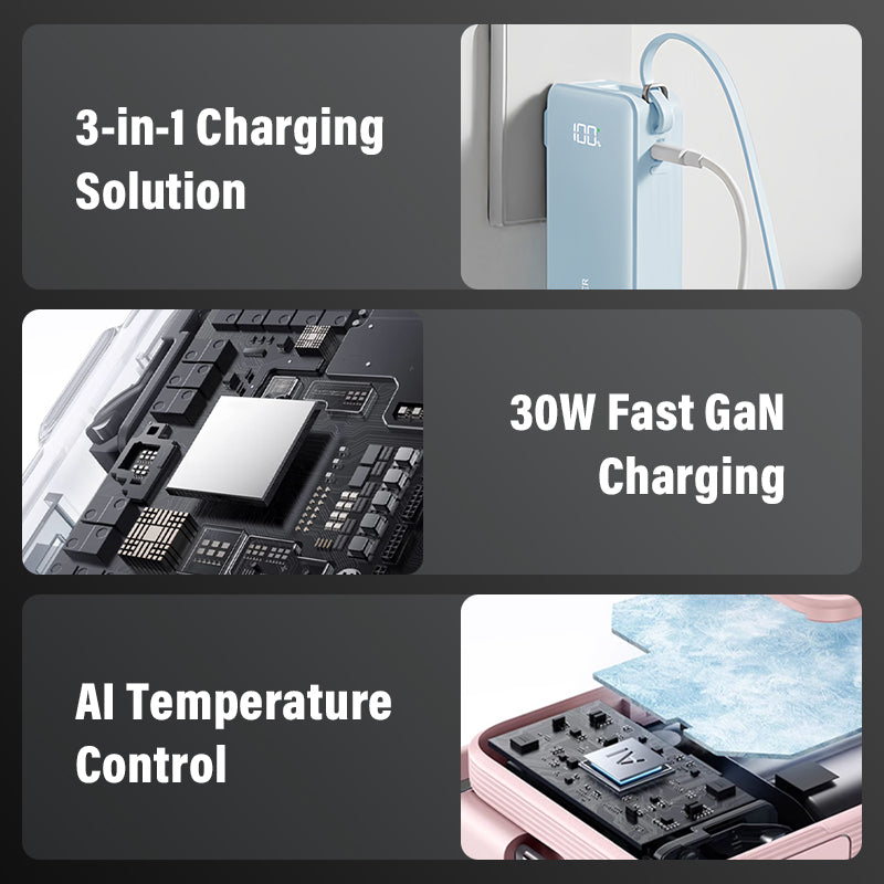 30W GAN FAST CHARGE WITH HIGH-DENSITY CELL: Equipped with a 30W GaN charger and Tesla-grade 10,000mAh cell, it delivers rapid charging for two devices simultaneously. Powers iPhone 16 to 60% in just 30 minutes.