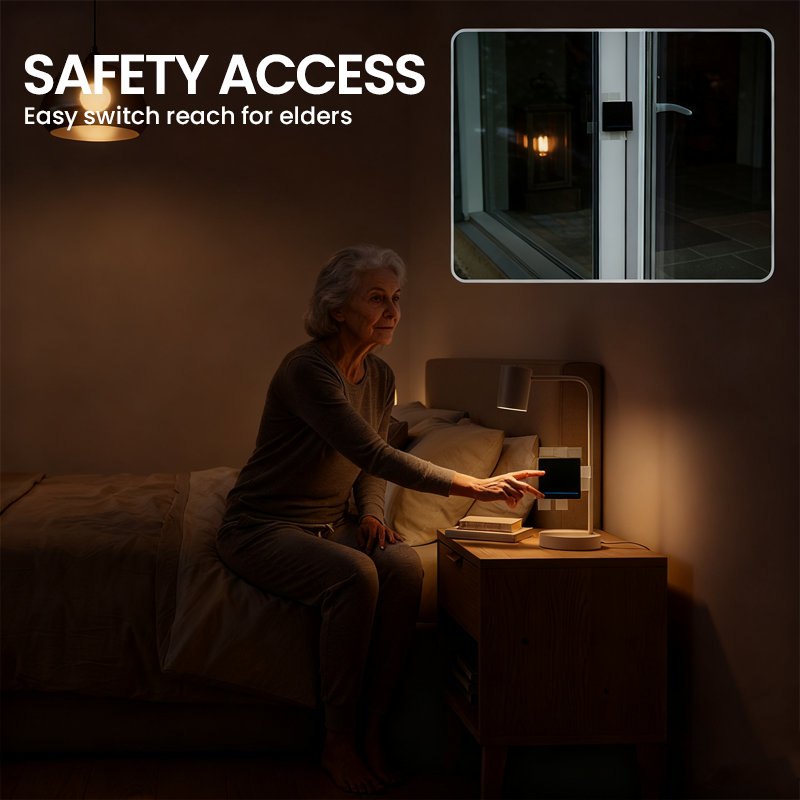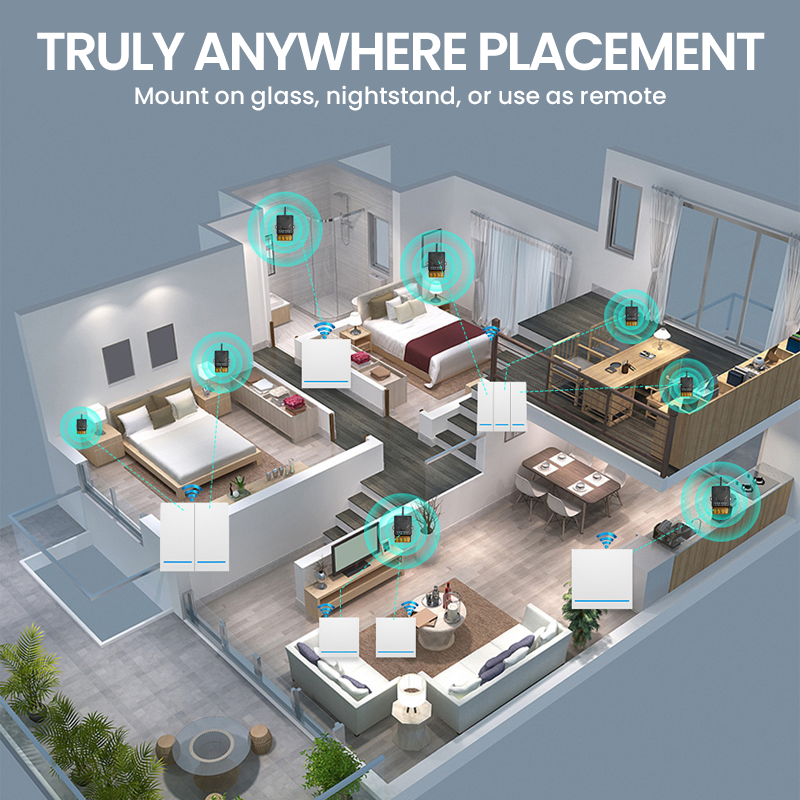 ULTIMATE PLACEMENT FLEXIBILITY - Break free from fixed switch locations. Mount the panel on glass, place it on your nightstand, or even use it as a portable remote, giving you unparalleled convenience and accessibility.