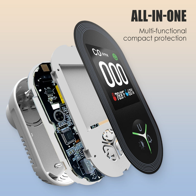 KOMPAKT ALLT-I-ETT-SKYDD – Denna multifunktionella enhet integrerar flera säkerhetsfunktioner i en enhet, inklusive kolmonoxid-, temperatur- och fuktighetsdetektering, samt valfri detektering av brandfarlig gas. Trots sin kompakta storlek erbjuder den kraftfull funktionalitet och ger skydd i hemmet dygnet runt för trygghet och ro.
