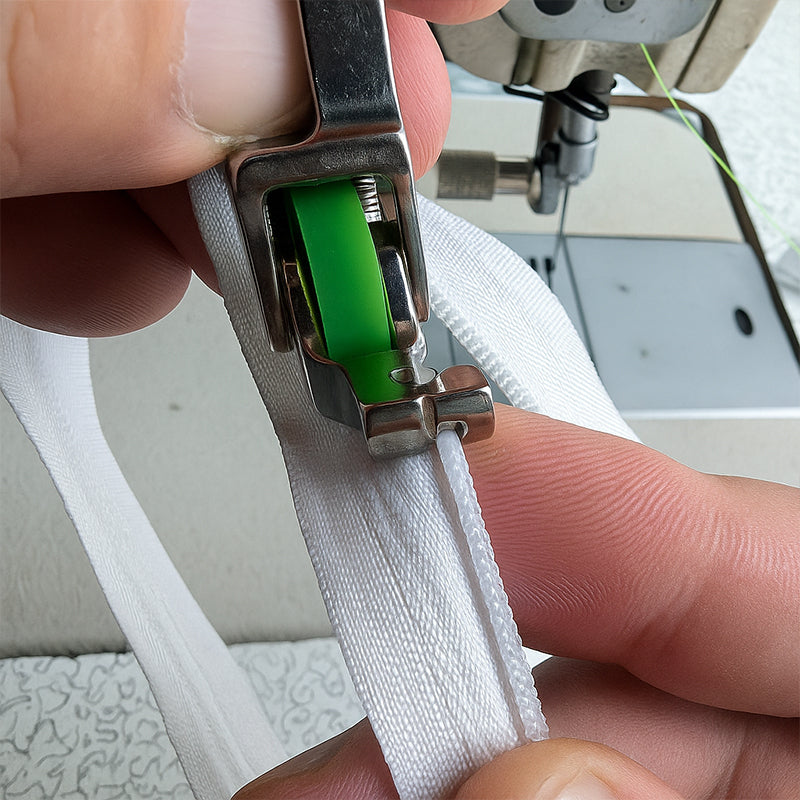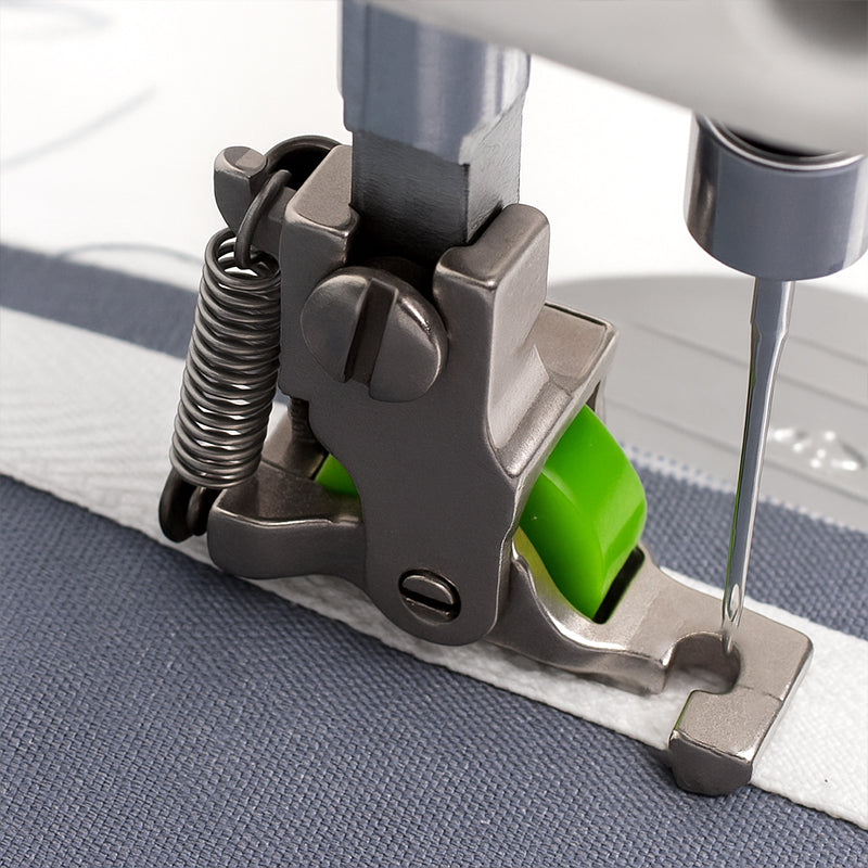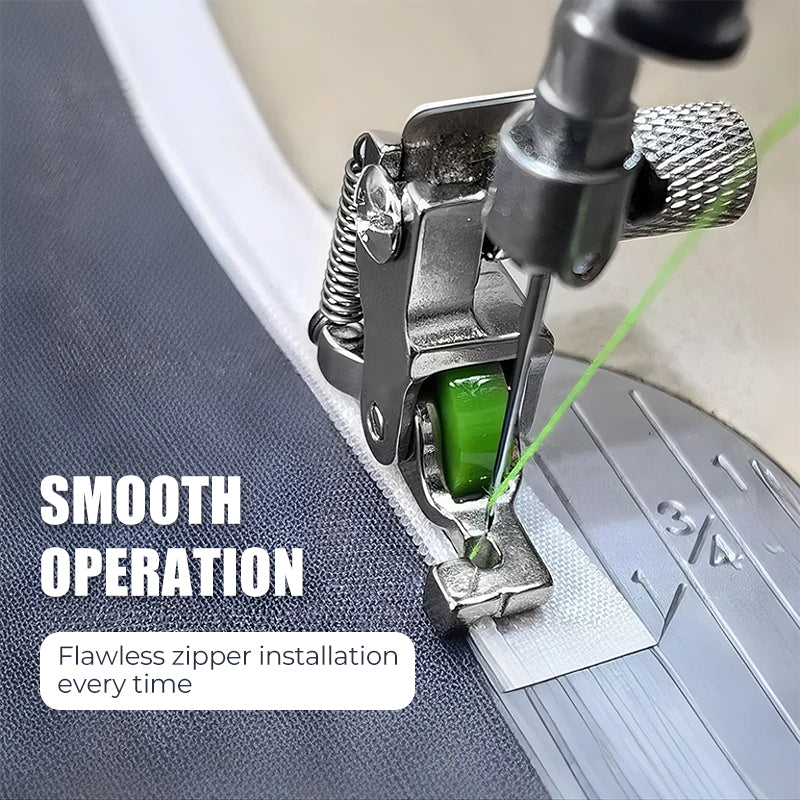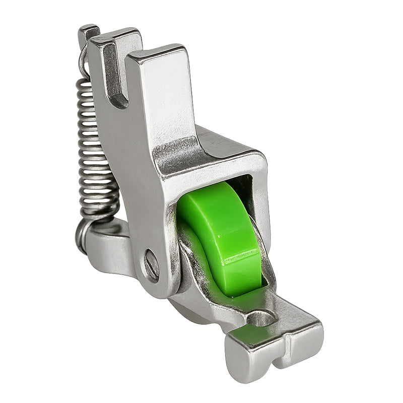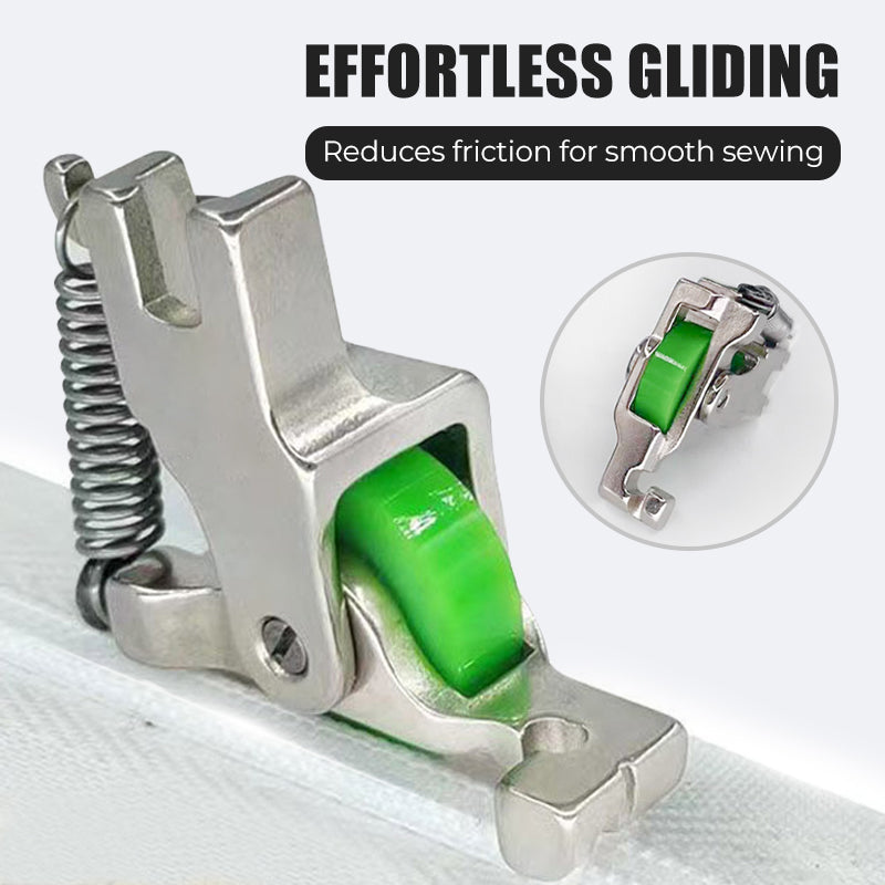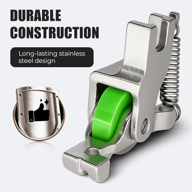 ENKEL OCH SMIDIG ANVÄNDNING: Vår rullfot kombinerar skrynkelfri teknik med ett inbyggt hjul för felfri blixtlåsmontering. Den glidande designen förhindrar att blixtlåset skrynklar sig samtidigt som den minskar friktionen, vilket säkerställer professionella resultat på ömtåliga material och sparar tid på projekt med hög volym.
