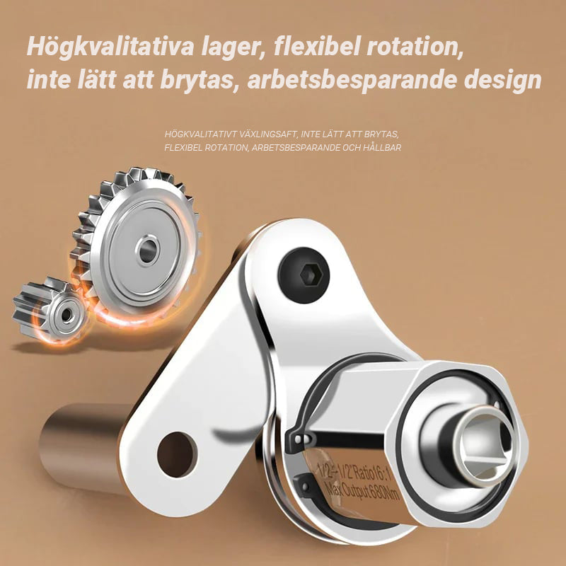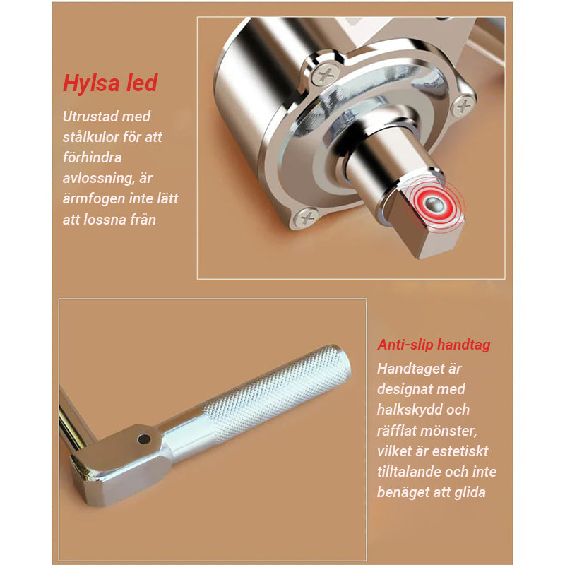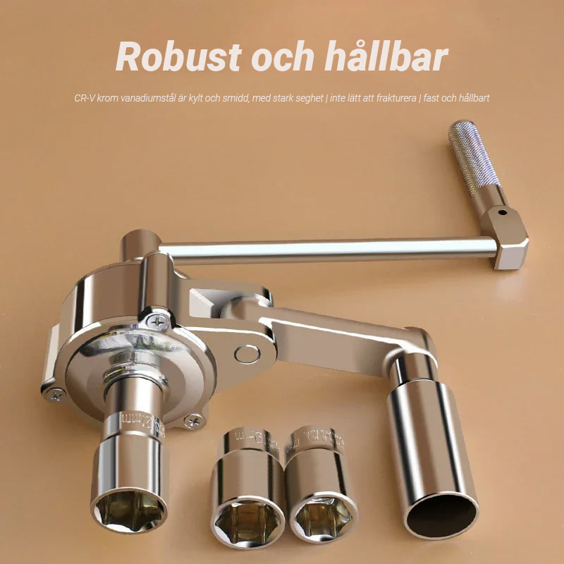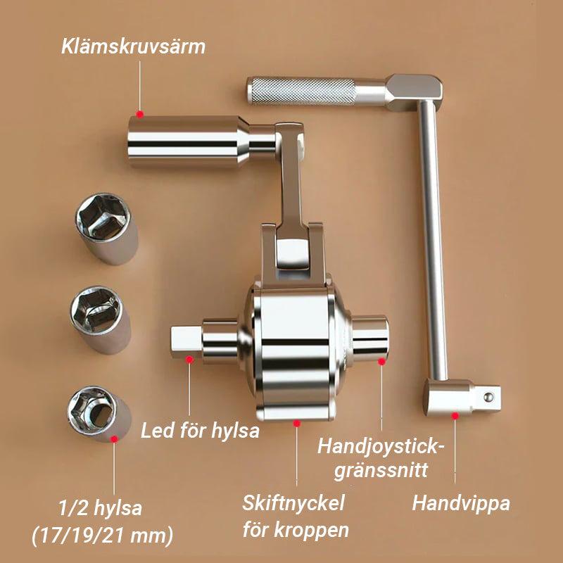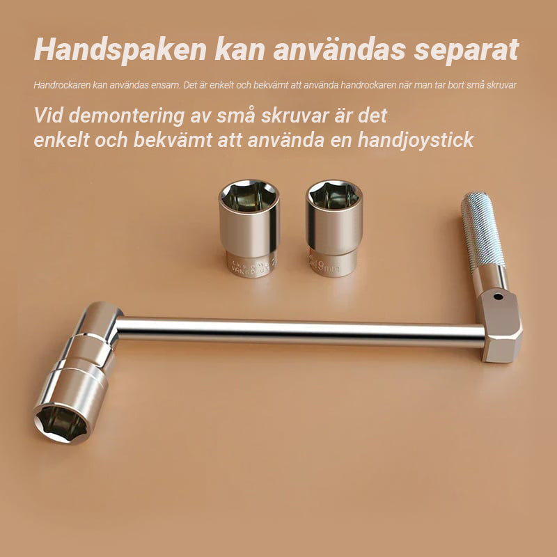 - Enkel att använda - anslut bara vevhandtaget och skjut den andra fasta hylsan på närmaste mutter för att få en stabil stödposition. Börja lossa dessa muttrar och använd handjoysticken när du demonterar den lilla skruven. Handjoysticken kan användas ensam, enkelt och bekvämt