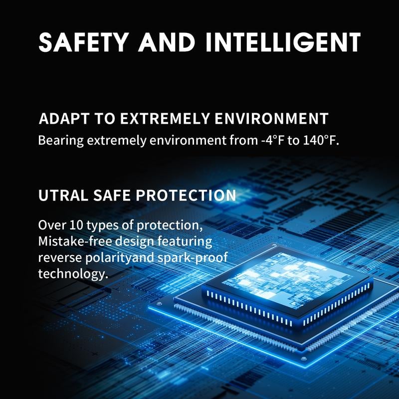 ă10 intelligenta och sĂ€kra skydd och stabil driftă: VĂ„r bilbatteristartare har 10 skyddssystem (omvĂ€nd polaritet, omvĂ€nd laddning, överdriven urladdning, omvĂ€nd anslutning, kortslutning, överbelastning, överström, överhettning, gnistmotstĂ„nd). Denna högeffektiva batteristartare garanterar din sĂ€kerhet under anvĂ€ndning och kan arbeta vid temperaturer mellan -30°C och 60°C, Ă€ven under extrema vĂ€derförhĂ„llanden.