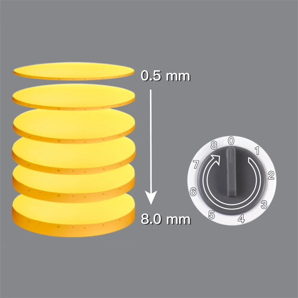 [Multifunktionella] Bladen ger flexibilitet att enkelt skÀra, skiva, strimla, hacka frukt och grönsaker i olika former och storlekar. Som en potatis kan du göra den till vanliga skivor eller sicksackskivor, strimlor eller mosa den lÀtt.