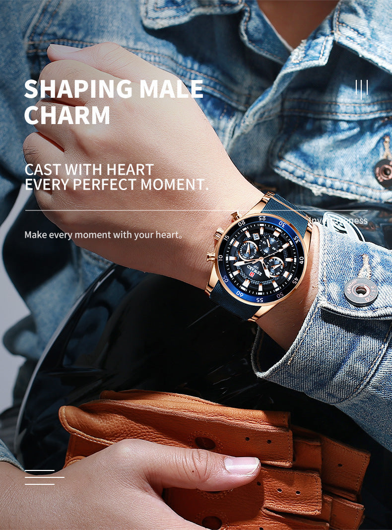 MULTIFUNKTIONSKRONOGRAFDESIGN: Håll koll på tiden med precision - tre subdials spårar sekunder, minuter och 24-timmarsformat, medan kalenderfönstret låter dig kontrollera datumet med en blick. Ett integrerat stoppur gör det möjligt för idrottare och proffs att enkelt ta tid för träning, möten eller dagliga uppgifter.